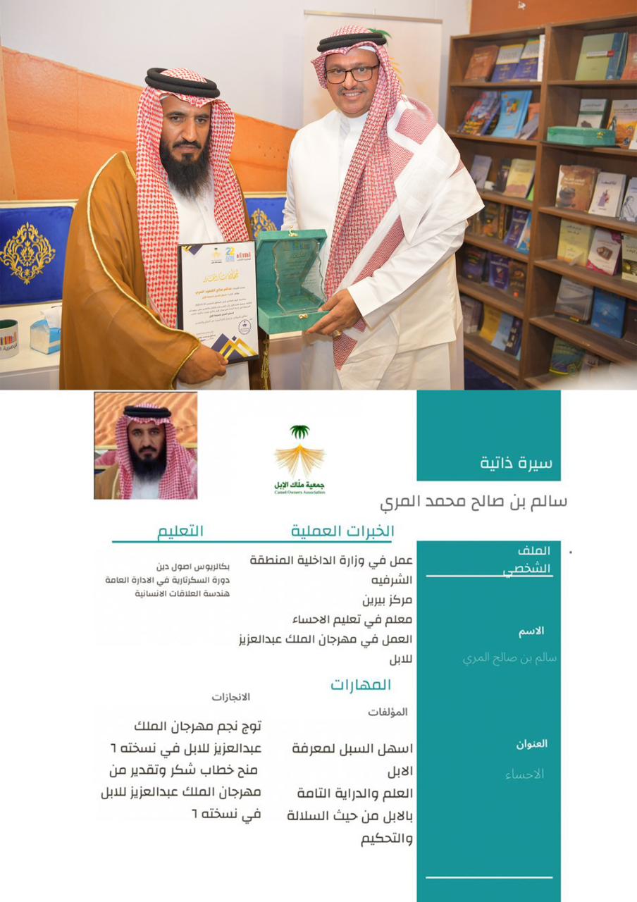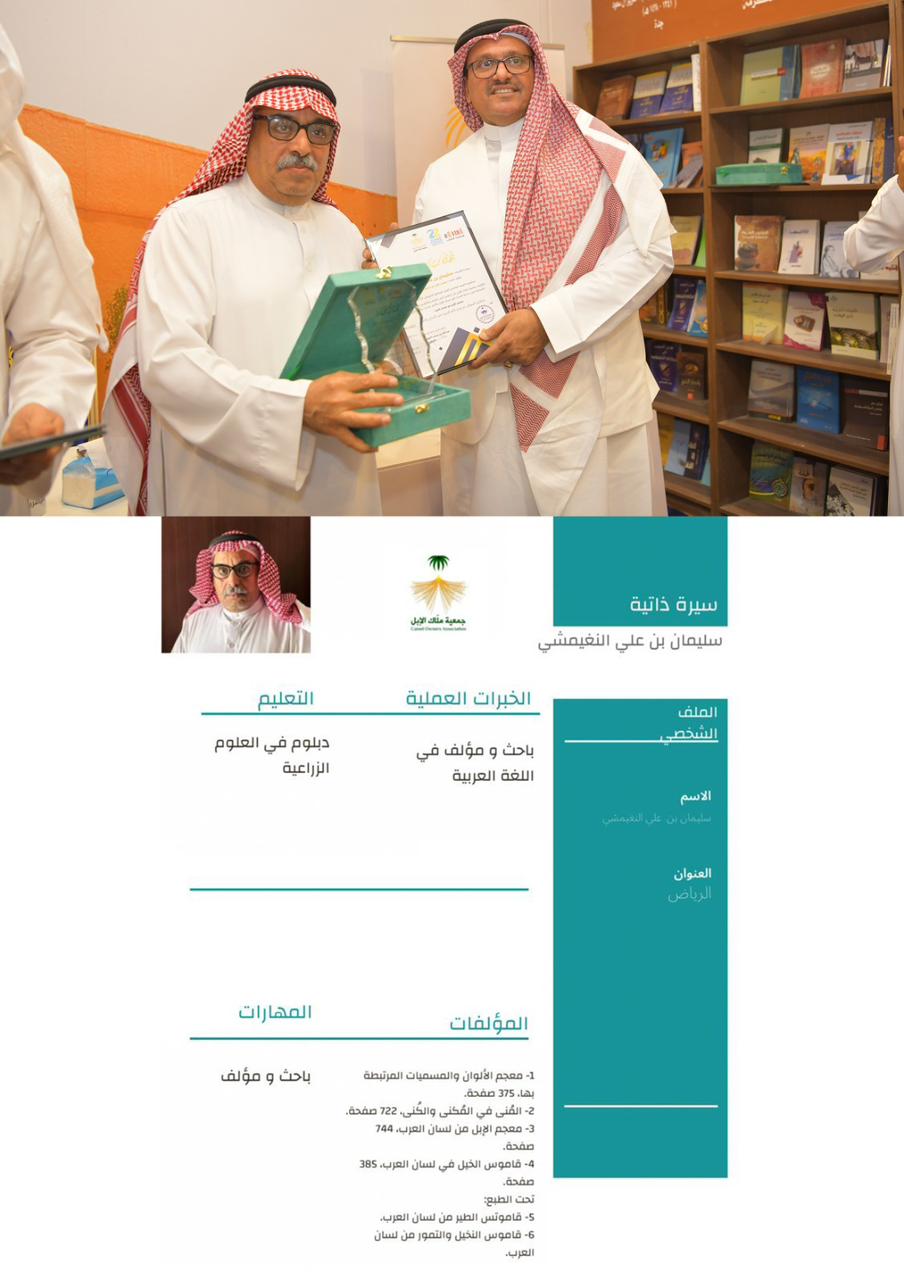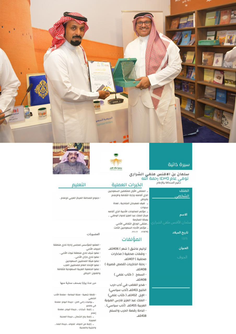 1- سلمان بن الأفنس بن ملفي الشراري رحمه الله – عن كتاب (الإبل عند الشرارات دراسة مختصرة لإحدى نجائب الابل العربية ) – منطقة الجوف وتسلم التكريم ابنه إبراهيم .